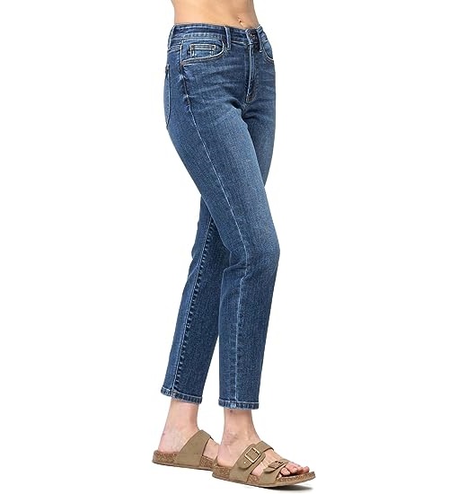 High Waist Slim Fit Jeans. These jeans have basic 5-pocket, Shield back pocket, Stretchy, Solid classic denim blue, Zip fly closure.